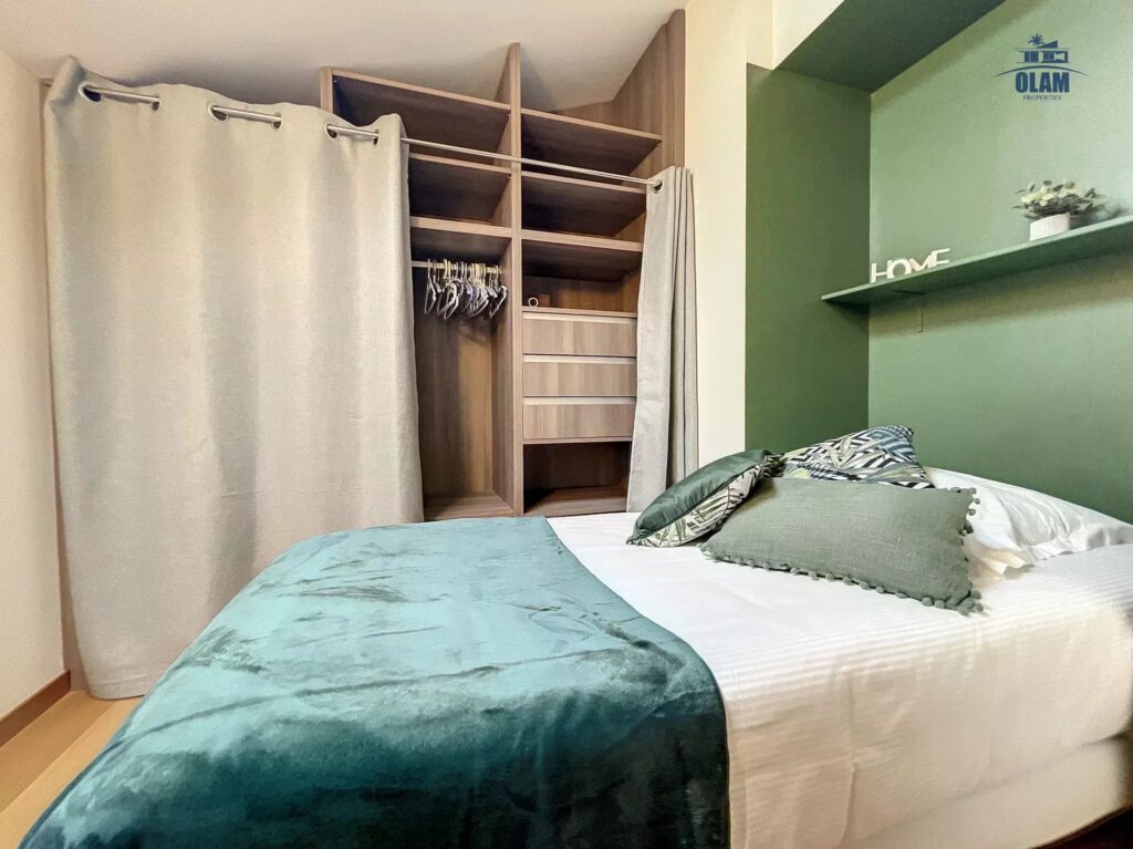 – 1 bedroom with double bed, storage space, desk