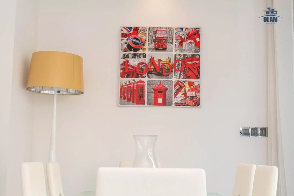 – a very large and bright modern living room with elegant decoration, corner sofa, very large TV screen and table for 6 people