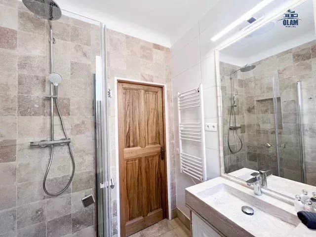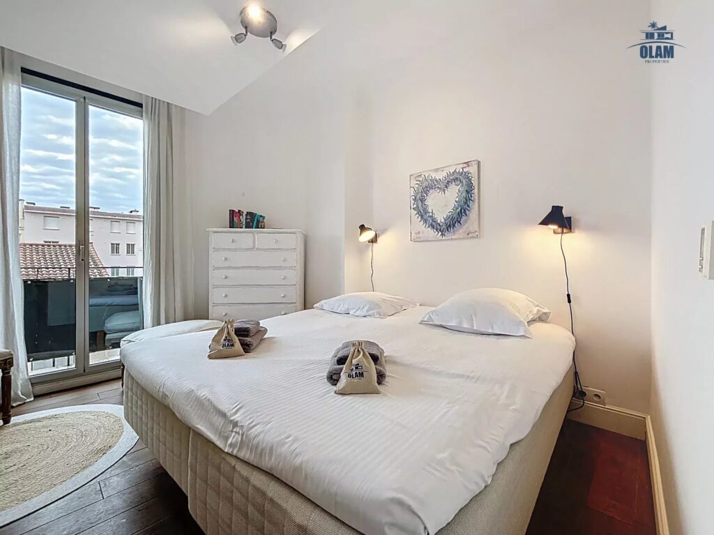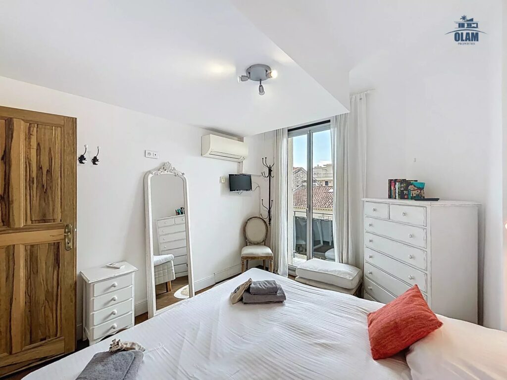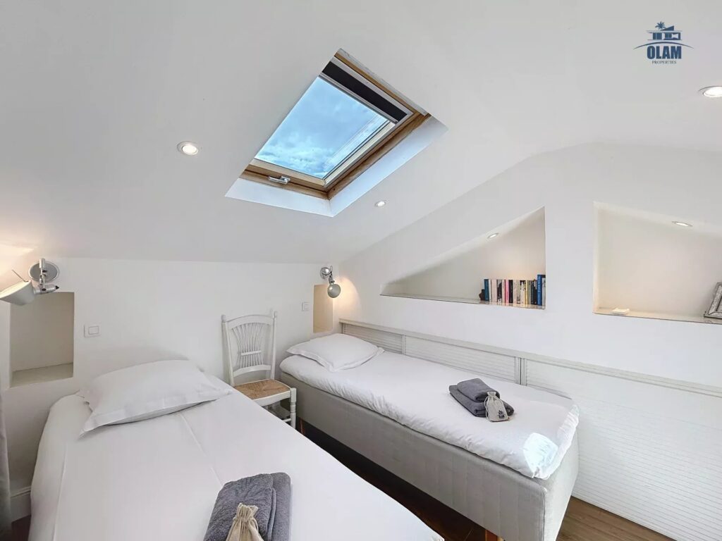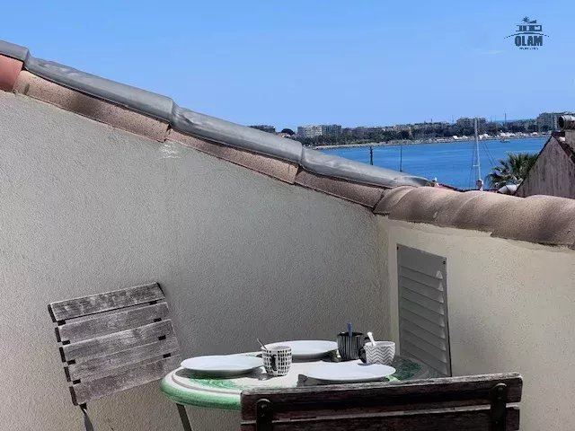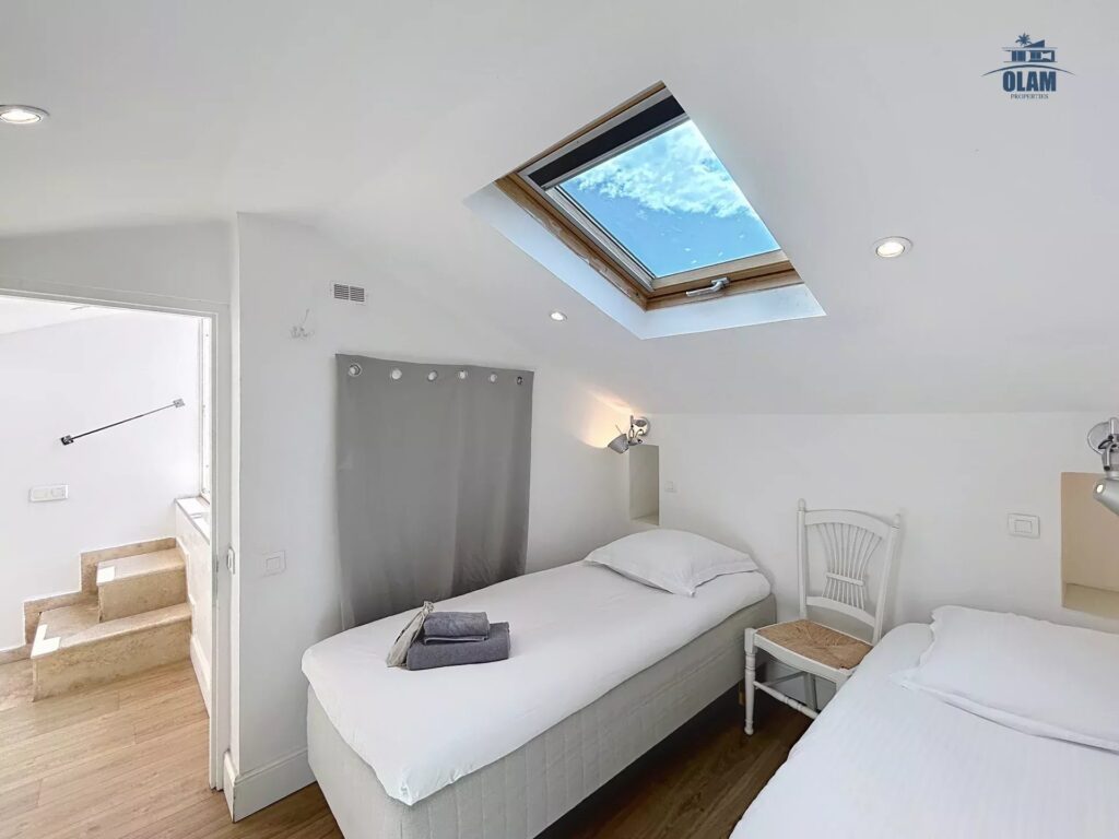On the 2nd level: a bedroom with two single beds or a double bed, a bathroom with a bathtub (taller guests should be aware that the ceilings are low), a rooftop terrace with unobstructed views of the Bay of Cannes, and a lovely table for 2/3.