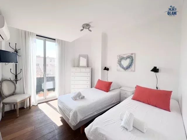 On the 1st level: a lovely living room (without air conditioning, with high ceilings) with a sofa and dining table, an open-plan kitchen equipped with a microwave, refrigerator, stovetop, coffee maker, toaster, air conditioning, kettle, dishwasher, washing machine, etc.), a full-length balcony, a bedroom with a single bed (120cm) with air conditioning, a bedroom with two single beds or a double bed, a shower room with a toilet, and a balcony with a table for 2.