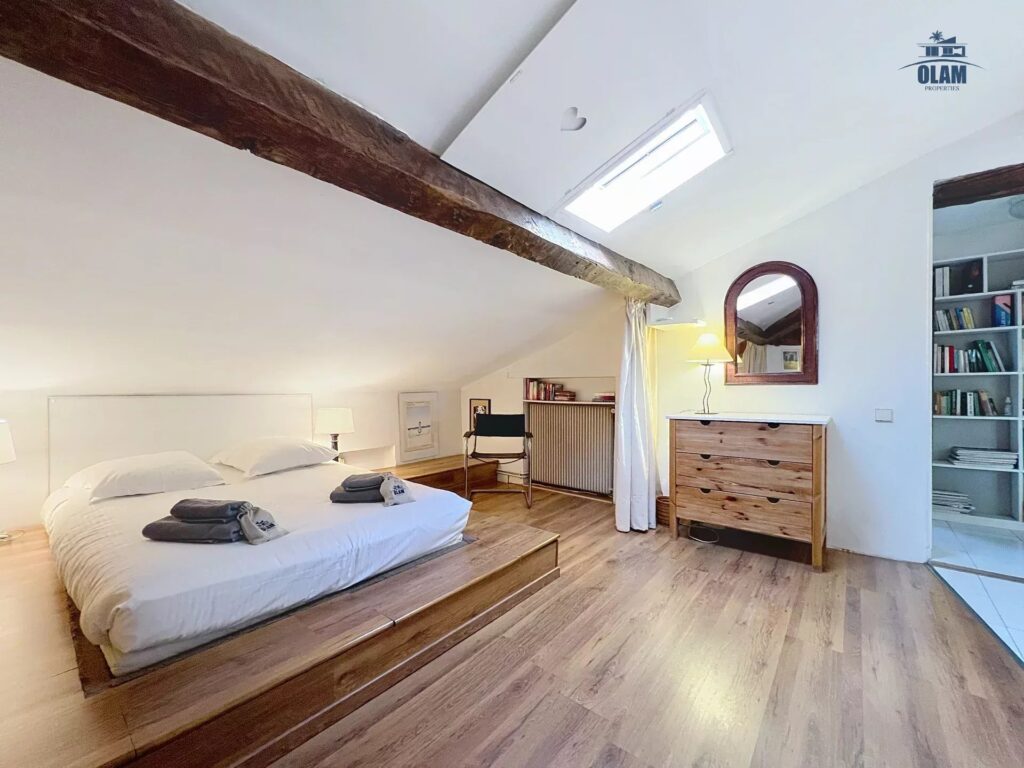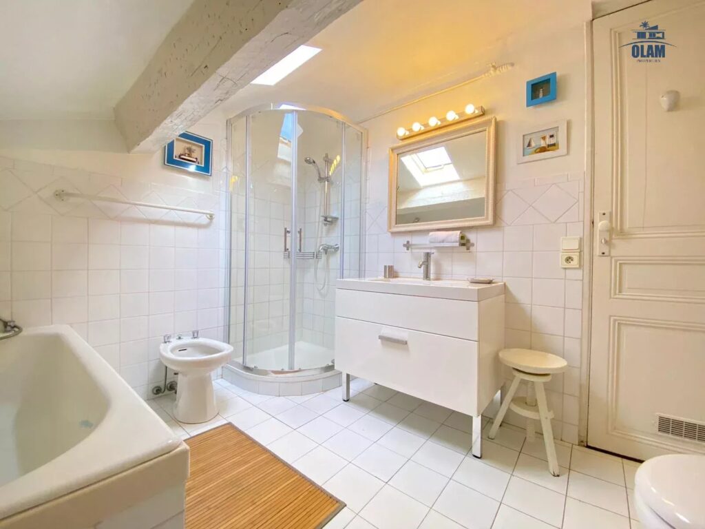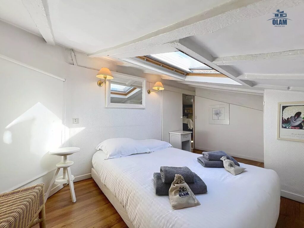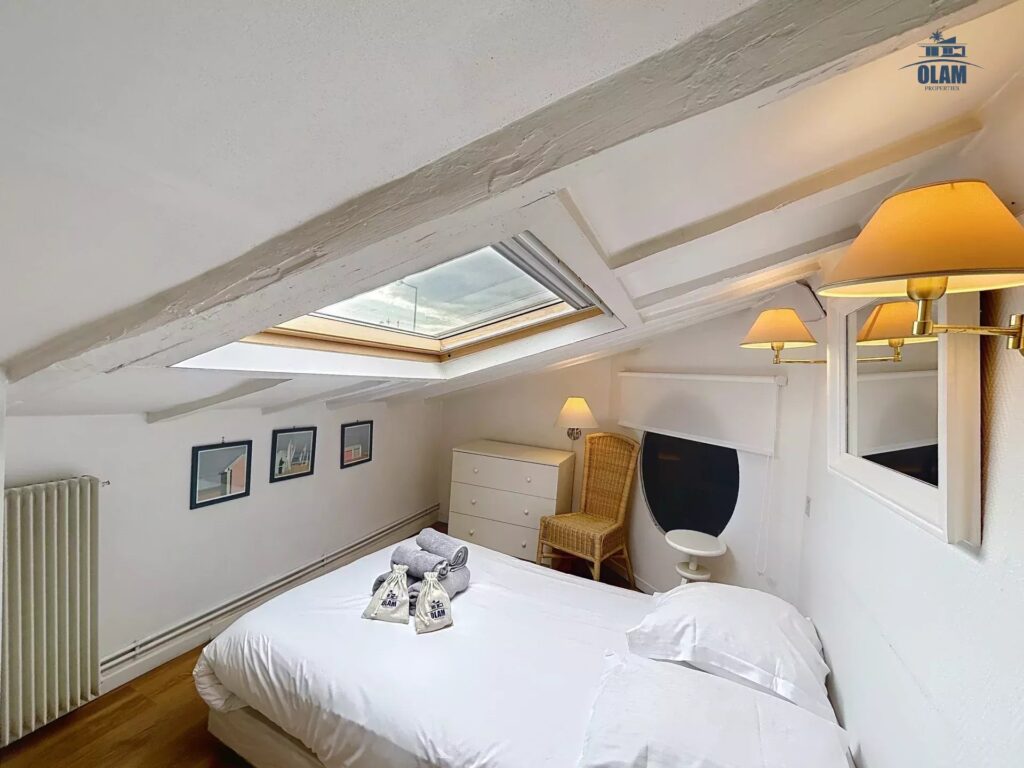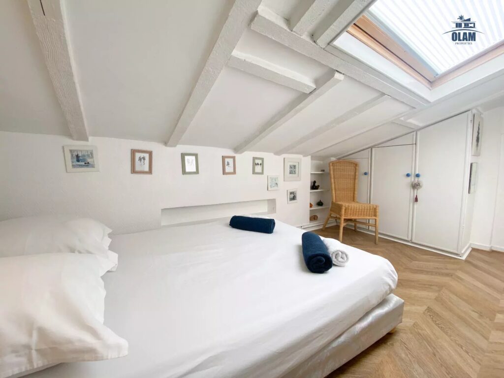 It is located on the 3rd and top floor (no elevator) of a charming old building. The apartment has a floor area of approximately 1076 sq ft. It has a sloping ceiling, and the ceiling height can be low in some areas. It comprises a large living room with a sofa, armchairs, a table for 4, and a TV. It also features a separate, fully equipped kitchen (stovetop, microwave, refrigerator/freezer, etc.). Two attic bedrooms with low ceilings in some areas are equipped with a closet and a 120cm single bed. A large bedroom with a 140cm double bed is also available. A bathroom with a bathtub, shower, and toilet is also available. The apartment is equipped with internet access and air conditioning in the living room, which allows for air circulation throughout the apartment. Private parking for one vehicle (uncovered) completes the property, just a 2-minute walk from the apartment.