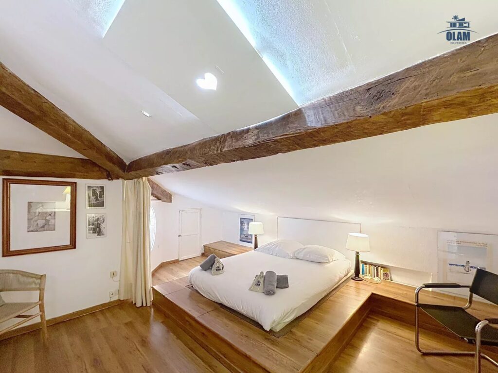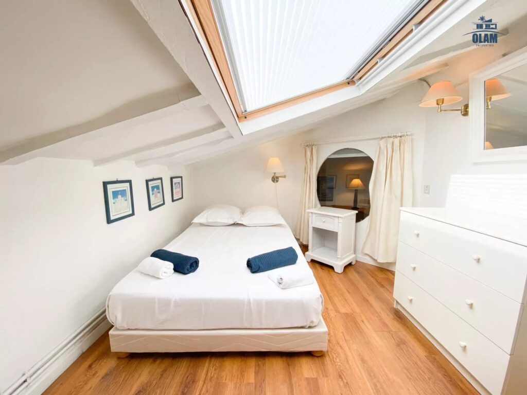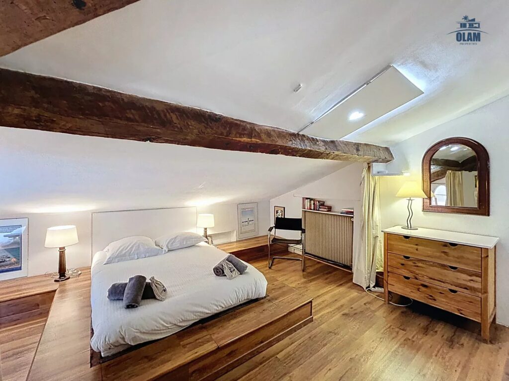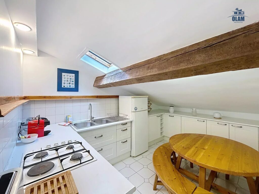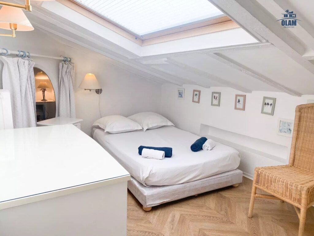 It is located on the 3rd and top floor (no elevator) of a charming old building. The apartment has a floor area of approximately 1076 sq ft. It has a sloping ceiling, and the ceiling height can be low in some areas. It comprises a large living room with a sofa, armchairs, a table for 4, and a TV. It also features a separate, fully equipped kitchen (stovetop, microwave, refrigerator/freezer, etc.). Two attic bedrooms with low ceilings in some areas are equipped with a closet and a 120cm single bed. A large bedroom with a 140cm double bed is also available. A bathroom with a bathtub, shower, and toilet is also available. The apartment is equipped with internet access and air conditioning in the living room, which allows for air circulation throughout the apartment. Private parking for one vehicle (uncovered) completes the property, just a 2-minute walk from the apartment.