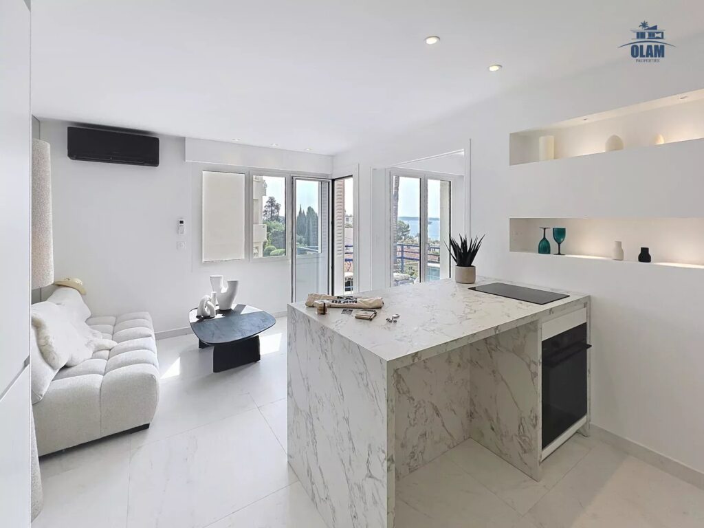 Renovated in 2025 with top-quality materials, this apartment boasts a splendid view of the sea and the Lérins islands. South, south-east exposure.