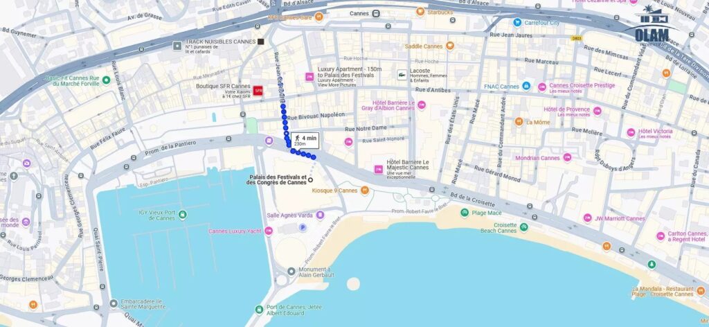 Ideally located, just a 4-minute walk from the Palais des Festivals and La Croisette, and less than a minute from the train station. All shops, including a pharmacy, supermarket, bakery, and bank, are located right outside the building. Public transportation is available at the foot of the building, and a paid public parking is 1076 ft away.