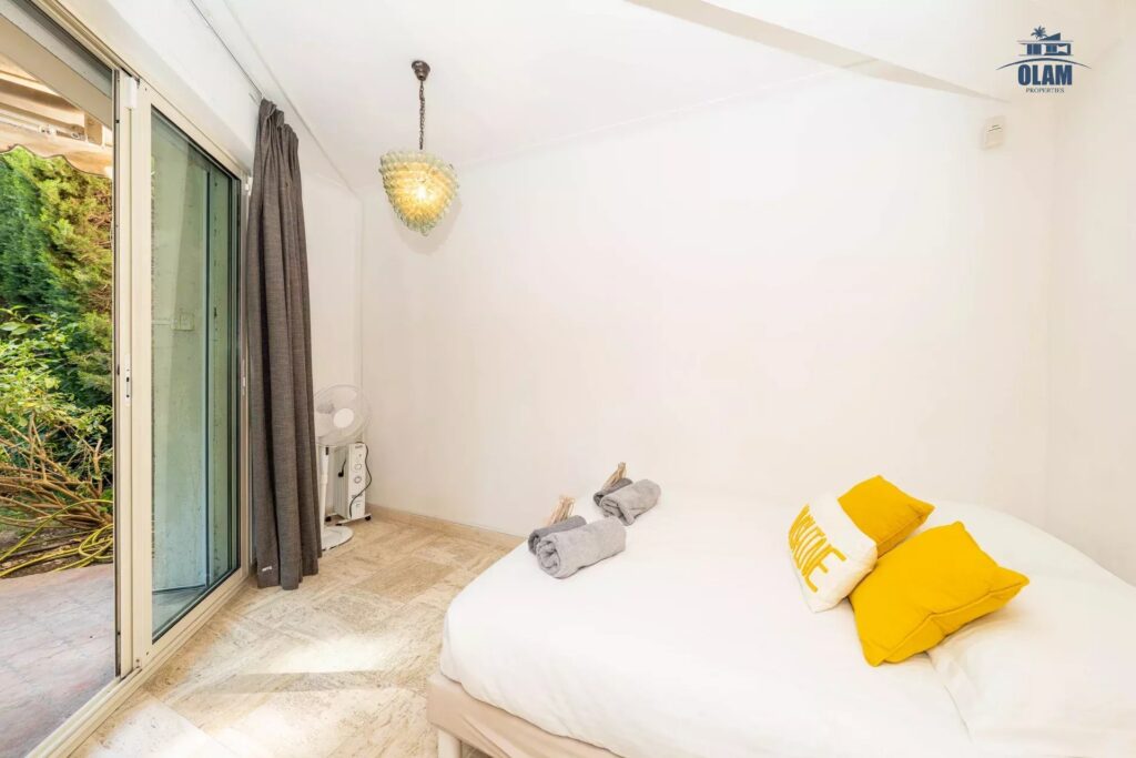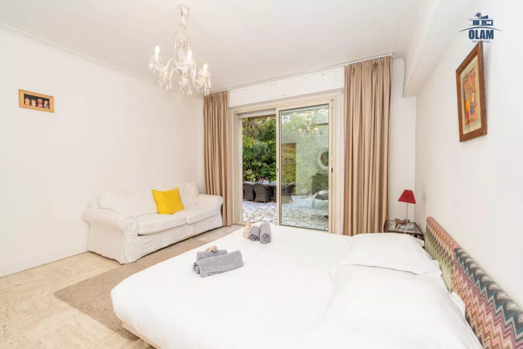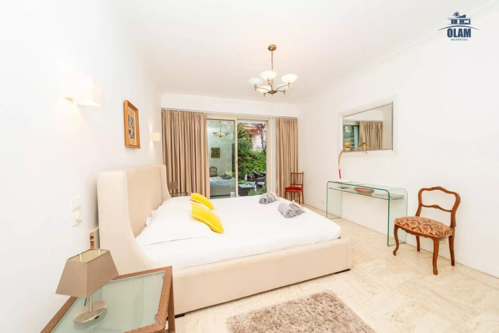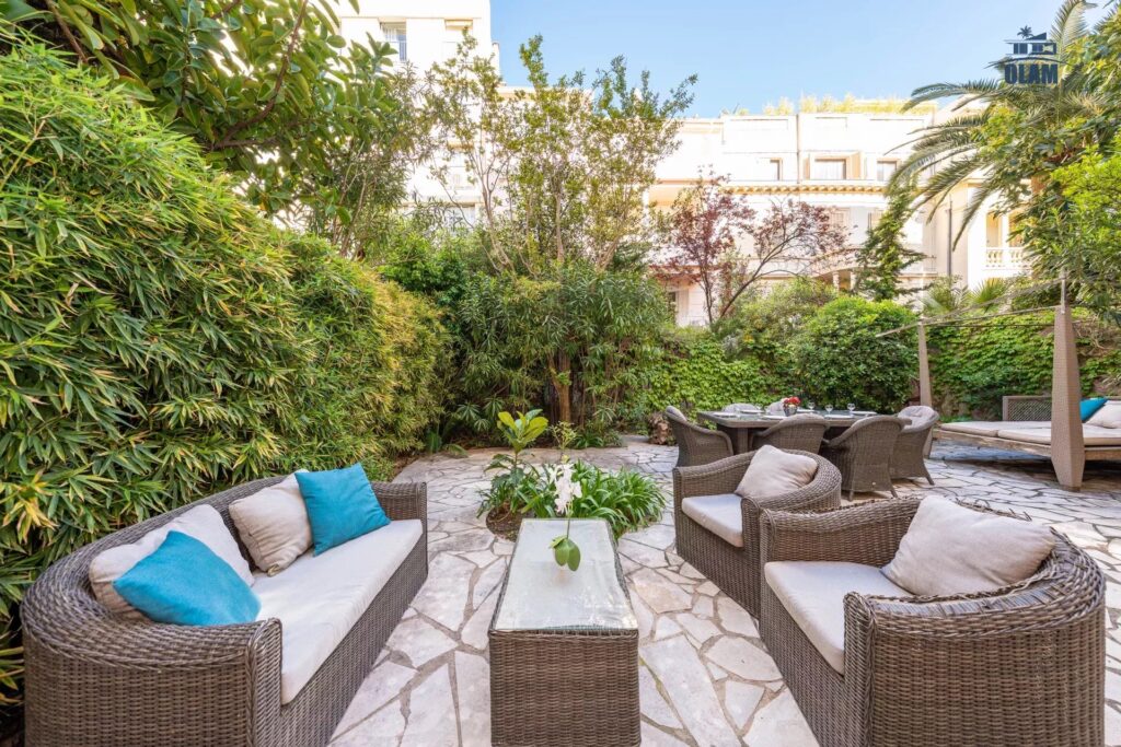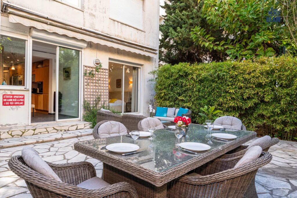 Luxurious 1614 sq ft apartment located on the ground floor, with 2 private gardens (807 sq ft & 915 sq ft) it can accommodate up to 8 people and includes 4 bedrooms (one with king size bed, one with 2 single beds that can be joined, another bedroom with 2 single beds that can be joined), a smaller bedroom with a double bed, a dressing room and 3 en-suite bathrooms (one with a bathtub and the other two with a shower). The living room has a television and a DVD player. The apartment is equipped with WIFI internet and air conditioning. The American kitchen is fully equipped (oven, microwave, dishwasher, washing machine, dryer, there is no parking but free spaces are located in front of the residence. The apartment is located on Boulevard de la Croisette, in a very quiet residence. It is close to all amenities (supermarket, grocery store, pharmacy, bakery… 50m away), only a 1-minute walk from the beach. For your leisure activities, the nautical base is 2152 ft away (sailing, canoeing, kayaking, etc.). The old port is a 25-minute walk and offers several departures for the Lerins Islands. A bus also provides a connection from Cannes to Nice via all the seaside towns.