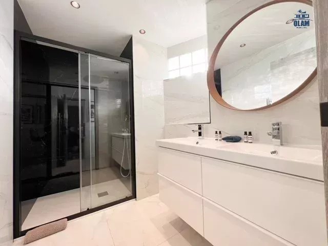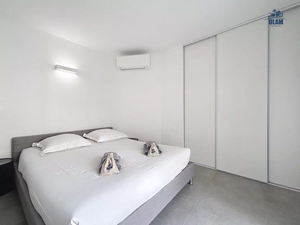 Located on the 3rd floor (with elevator), it comprises a south-facing living/dining room (with single sofa bed), a large open kitchen fully equipped (oven, dishwasher, microwave oven, hob, fridge-freezer, Nespresso coffee machine, washing machine, etc.), a bedroom with a 140cm double bed, its own shower room and large dressing room, and a second west-facing bedroom with a 160cm double bed. This second bedroom has its own balcony. It is fully air-conditioned, with high-speed internet access.