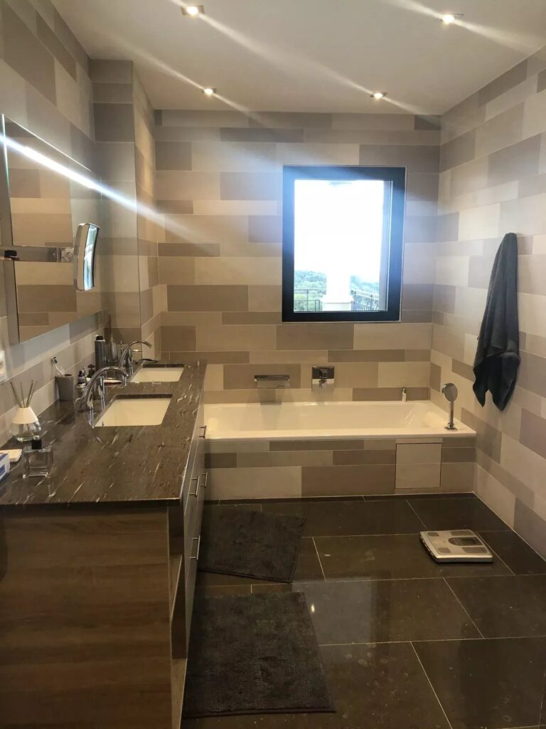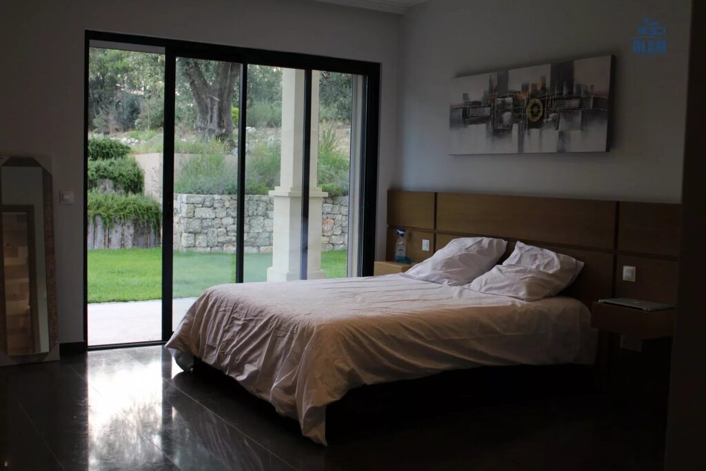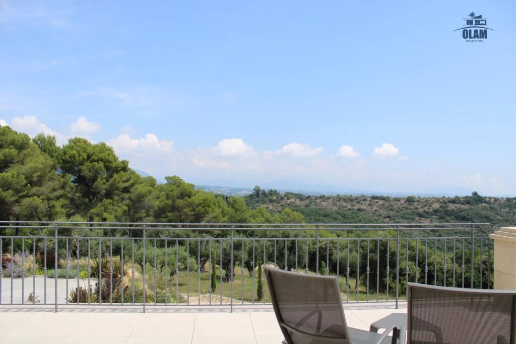This amazing modern villa located in the park of several hectares bordered by century-old olive trees, half an hour from Cannes and 25 minutes from Nice airport, offers a breathtaking view to the hills and the Mediterranean.The villa was built with high quality materials, is air conditioned and is fully equipped with home automation.Upon entering you will be charmed by the majestic chandelier several meters high, as well as the monumental stairs that leads to the bedrooms. This luxurious property in absolute calm consists of 4 bedrooms of 20 to 35m2 each with king size bed and its own bathroom; 3 bedrooms even with their private terrace with panoramic view. 1 bedroom is on the ground floor, the others being upstairs. Possibility to add extra beds in some rooms, which can increase the total capacity of this property to a maximum of 12 people (at an additional cost)