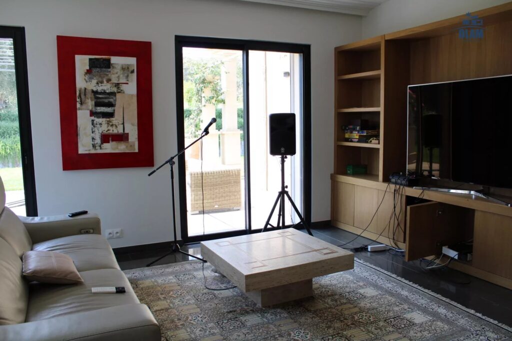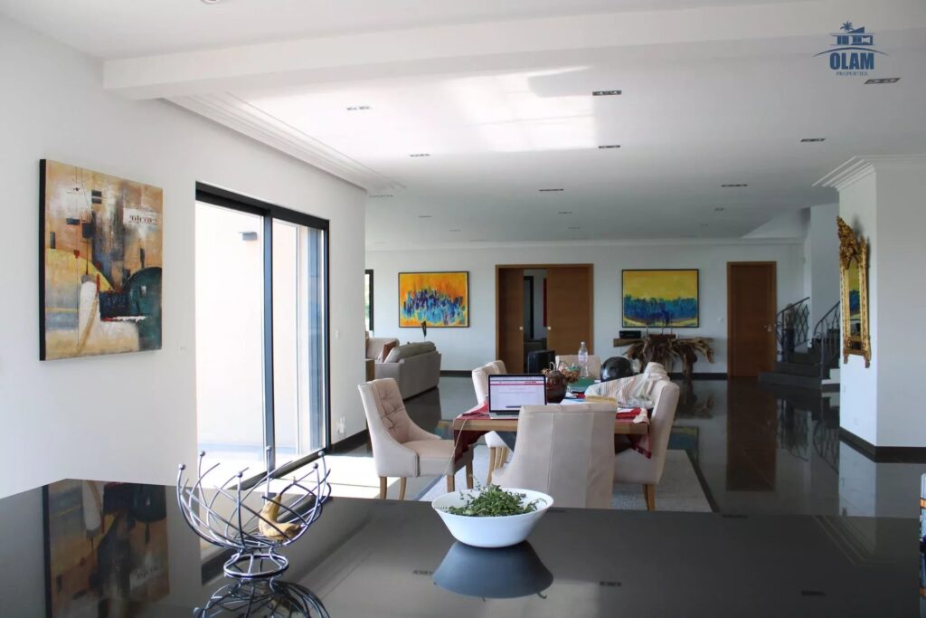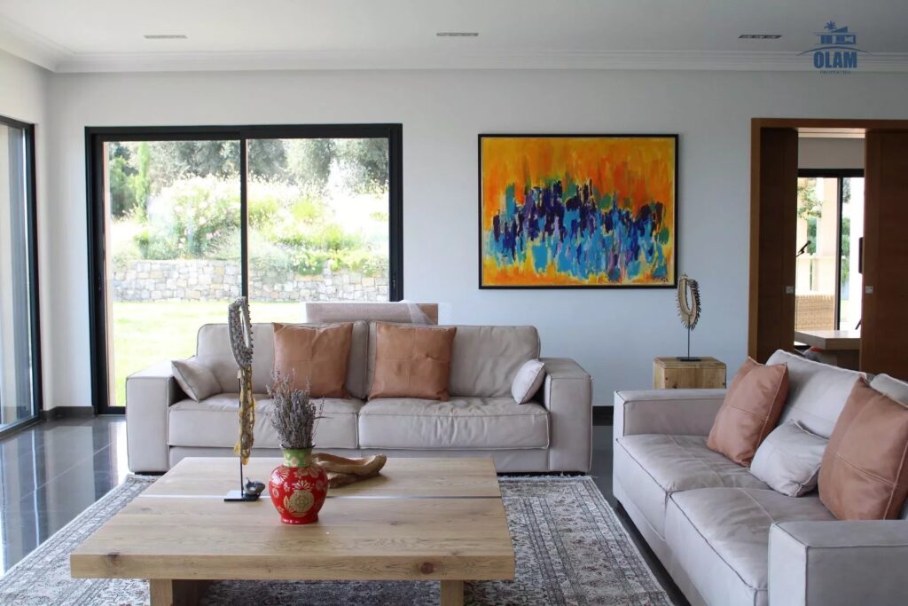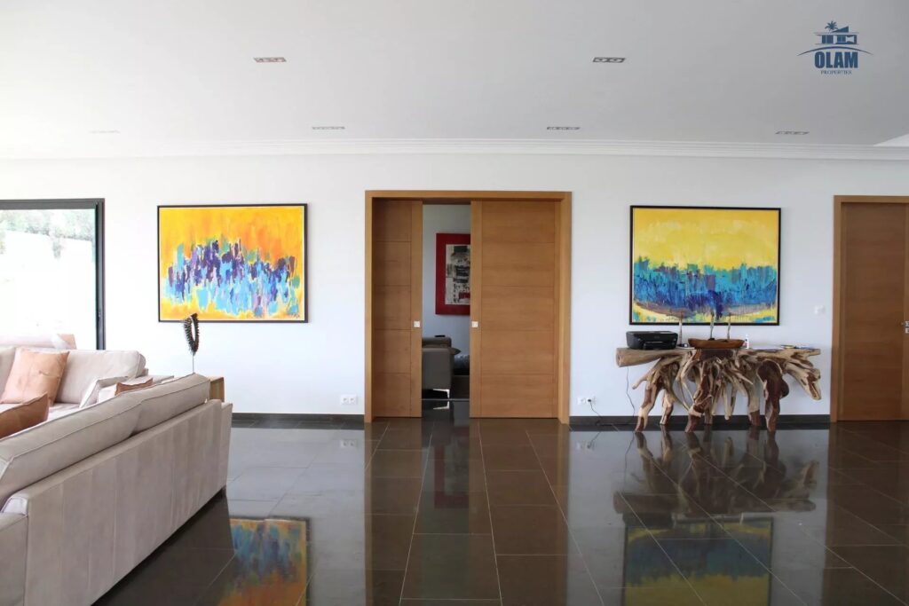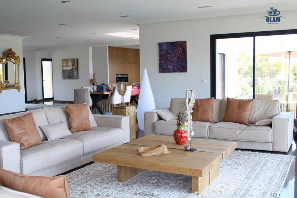 The living-dining room of nearly 150 m2 with an open kitchen overlooks the garden and the swimming pool, as well as an adjoining TV lounge.