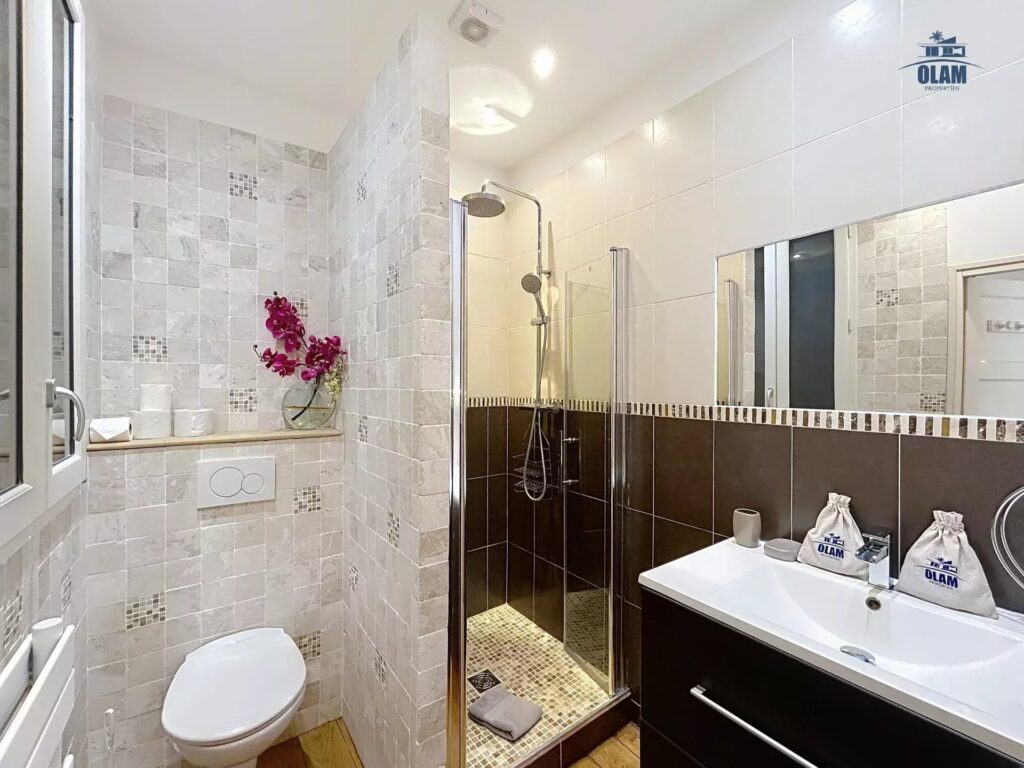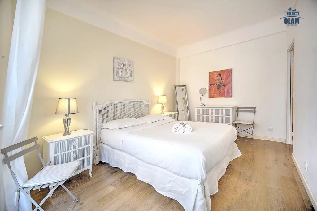 La chambre offre un grand lit double, à côté une salle de douche. Il est possible uniquement sur demande d’avoir un lit d’appoint dans le séjour (matelas). Le bien se situant dans un quartier animé de Cannes, il dispose du triple vitrage.
