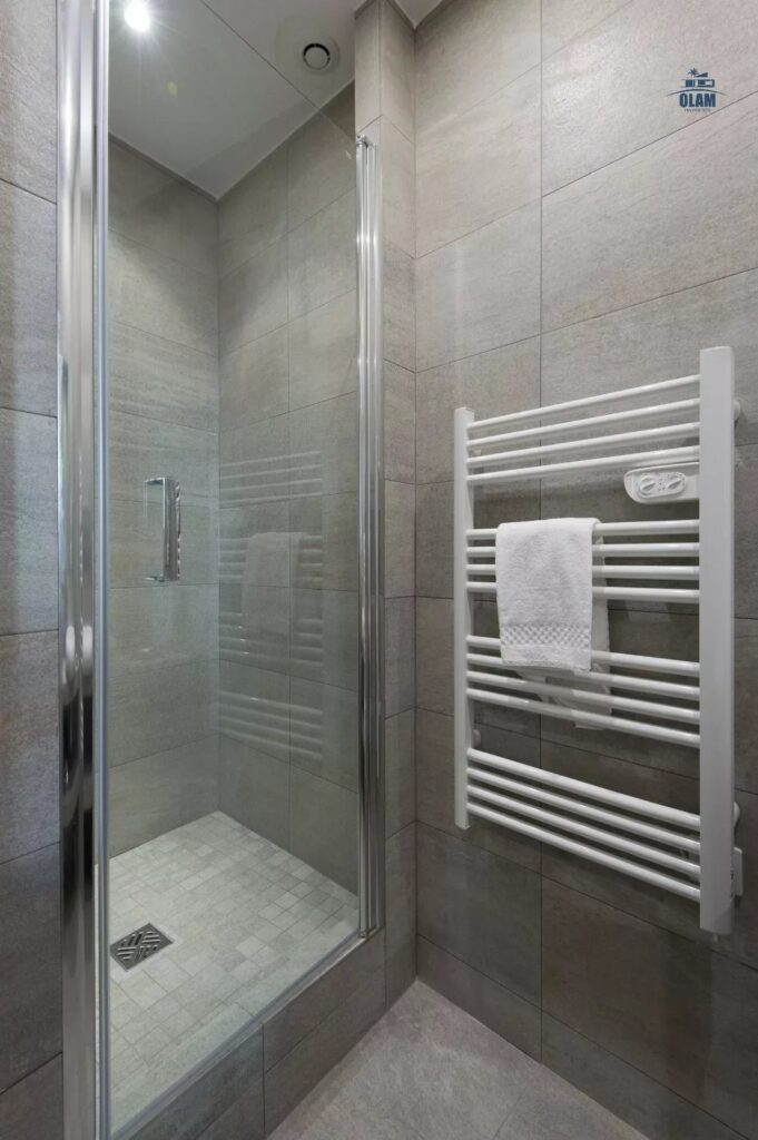 Chaque chambre a sa propre salle-de-bain avec douche. L’une d’elle a également un toilette séparé. Des toilettes invités sont aussi disponibles.