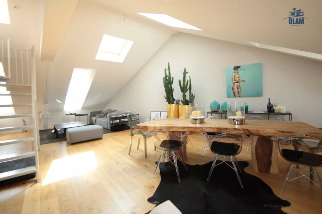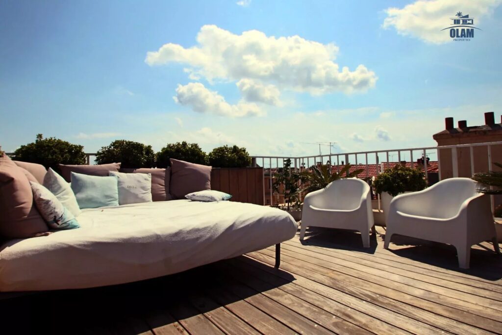 Magnifique 5P atypique et original sur Cannes. Situé au dernier étage d’un immeuble, cet appartement de 181m² vous offrira une vue incroyable sur le toit. Profitez d’un bain de soleil grâce à son solarium et les transats mis à disposition.