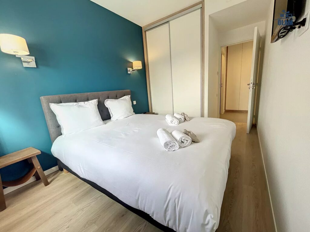 – Une chambre cosy : lit double, armoire avec cintres et télévision.