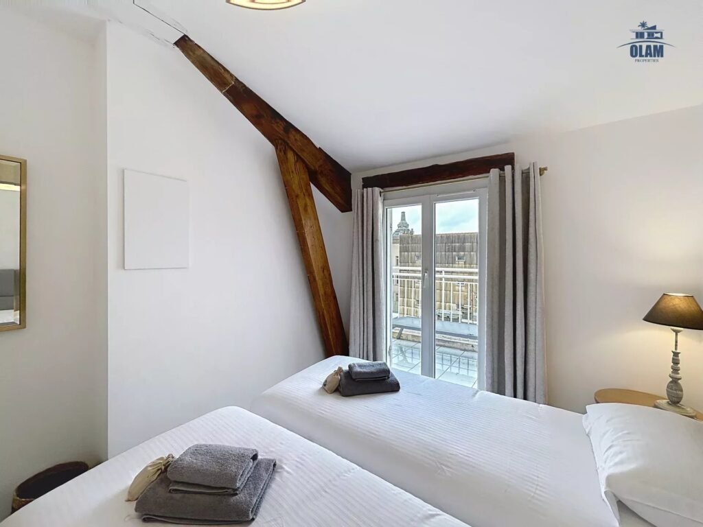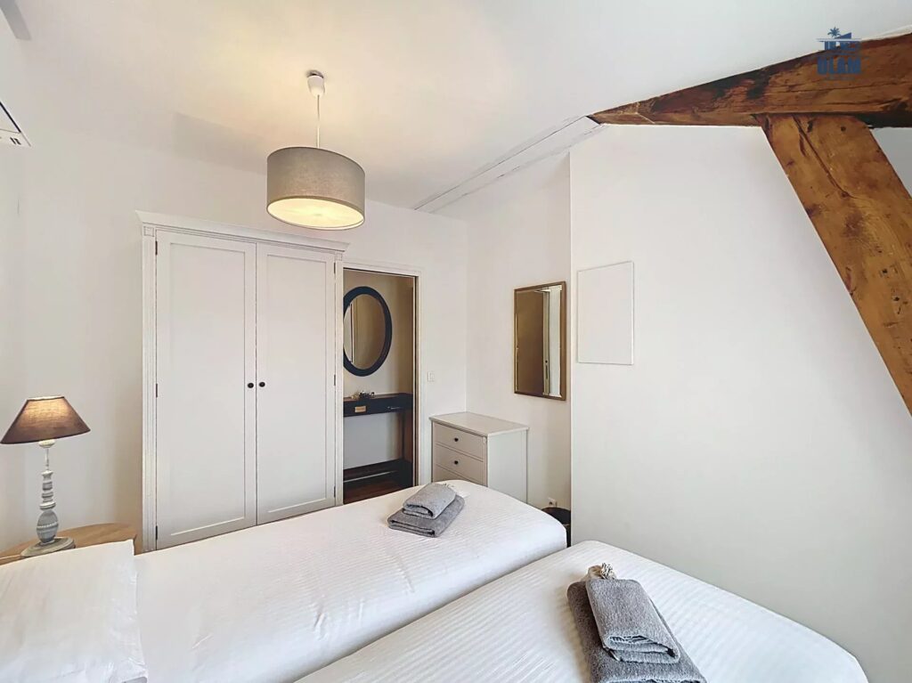 Cet appartement de 60m2 est composé d’un salon avec canapé convertible, une grande cuisine ouverte équipée (four, réfrigérateur, congélateur, plaque de cuisson, micro-ondes, lave vaisselle, machine à laver, cafetière, bouilloire,…) une chambre avec un lit double (160cm), une chambre avec 2 lits simples ou un grand lit, une salle de douche avec wc.
