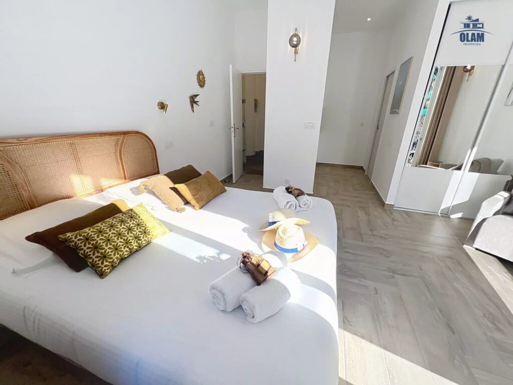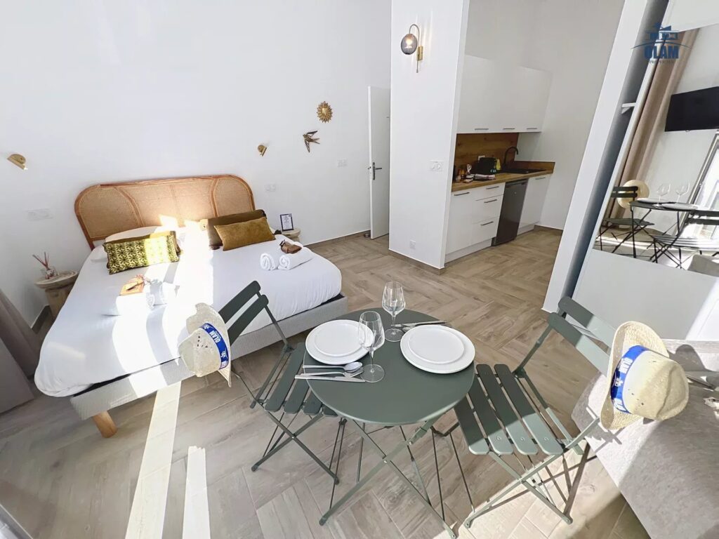L’appartement se compose d’une vaste pièce avec hauts plafonds, lit 160, TV murale, un coin lecture, un grand dressing et même un petit balcon d’angle où vous adorerez prendre un verre en fin de journée après une séance shopping ou bronzette…