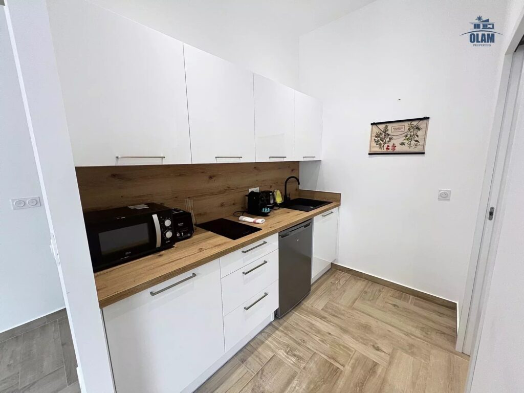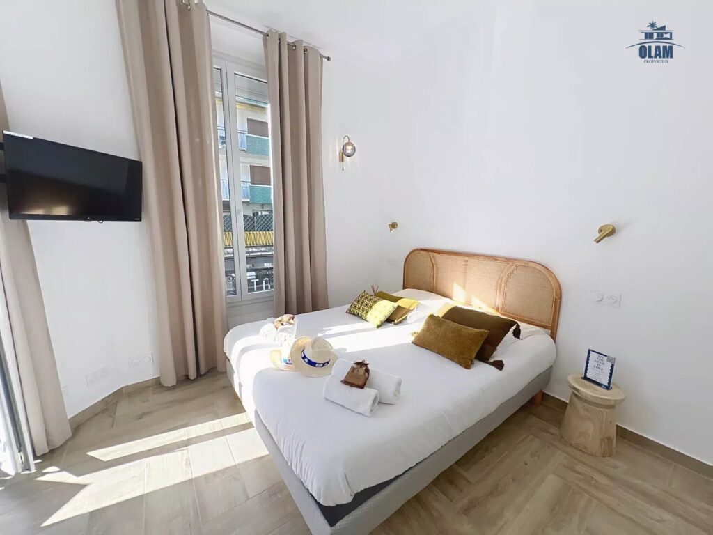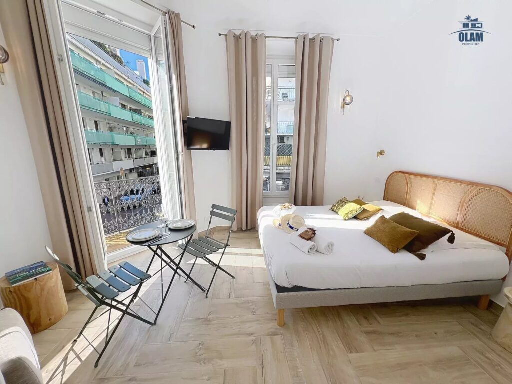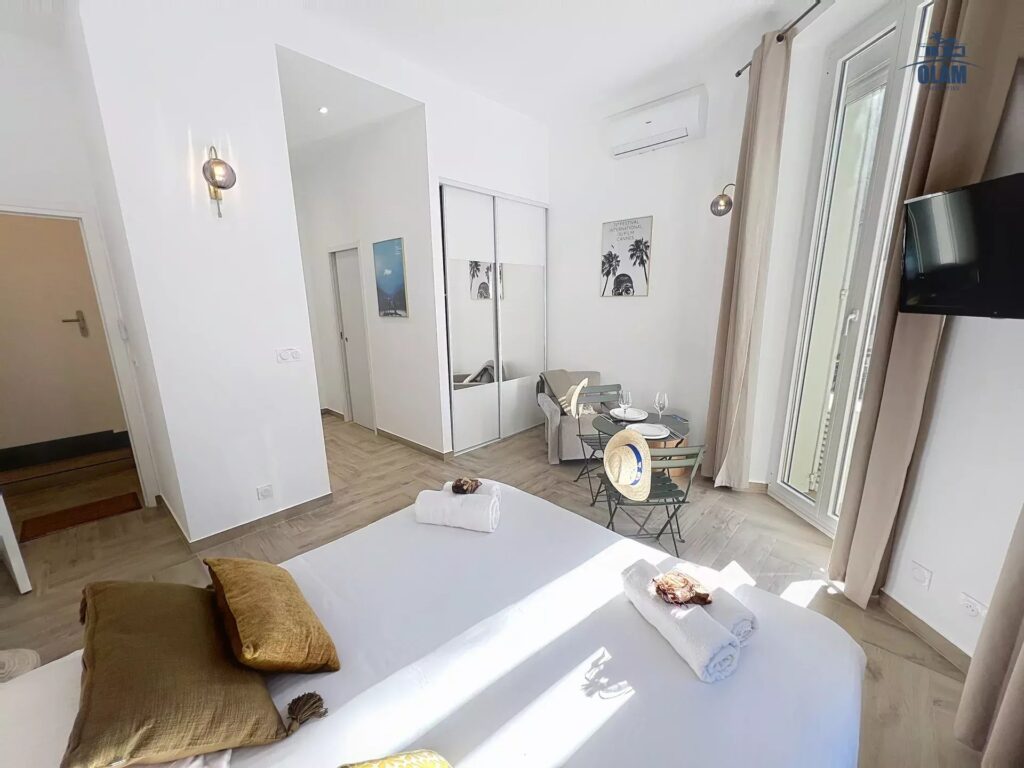 Tous les commerces sont à proximité, la rue d’Antibes est à 1 mn, et les plages à 4 – 5 mns, toujours à pied (la voiture n’est pas nécessaire).