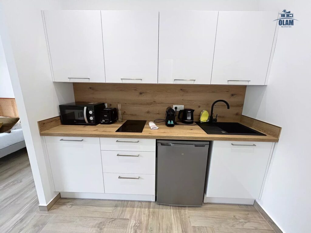 Vaste cuisine entièrement équipée et aménagée avec cafetière Nespresso, micro ondes, plaque vitro, vaisselle,… et une grande salle de douche moderne et confortable