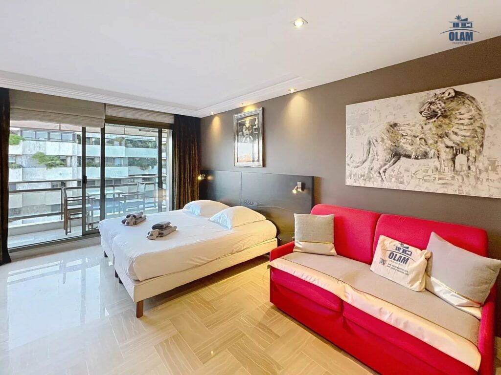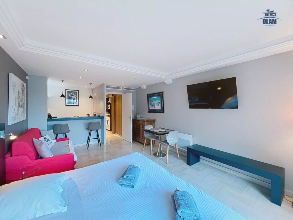 Luxueux studio de 35m² situé au sixième étage d’une jolie résidence avec ascenseur. L’appartement est composé d’une grande pièce à vivre lumineuse avec lit queen size (180cm) ou deux lits simples, espace salon avec canapé convertible (120cm de large). Cuisine ouverte entièrement équipée (réfrigérateur, table de cuisson, four micro-ondes, lave-linge, machine à café Nespresso,…). Salle de bains avec double vasque, wc séparés.