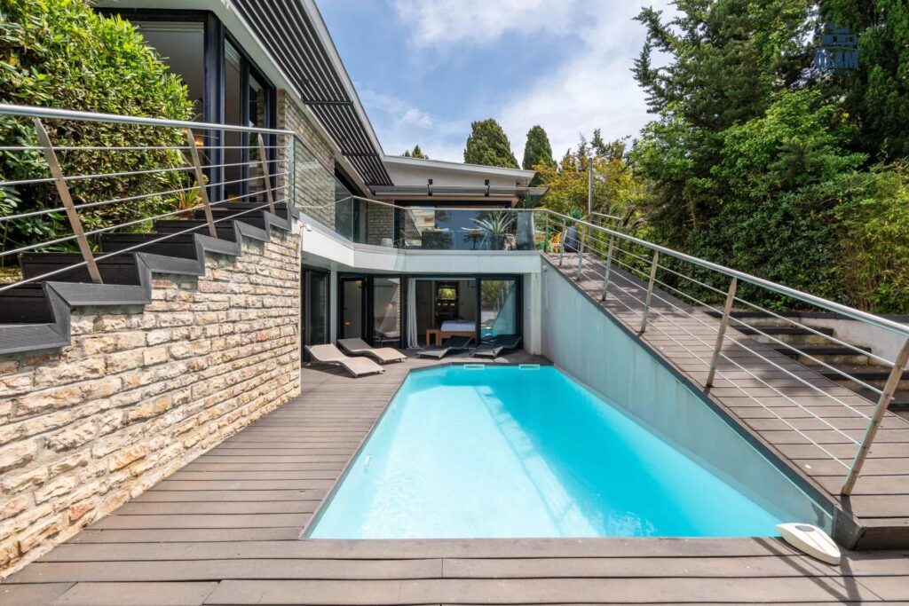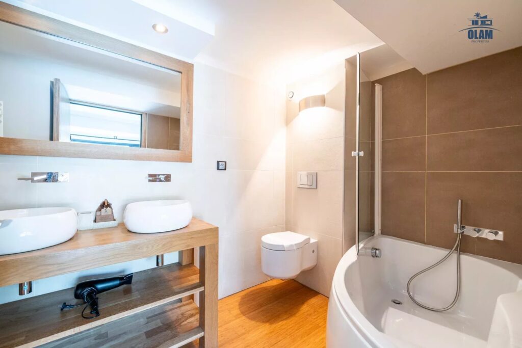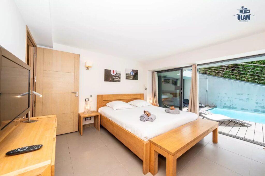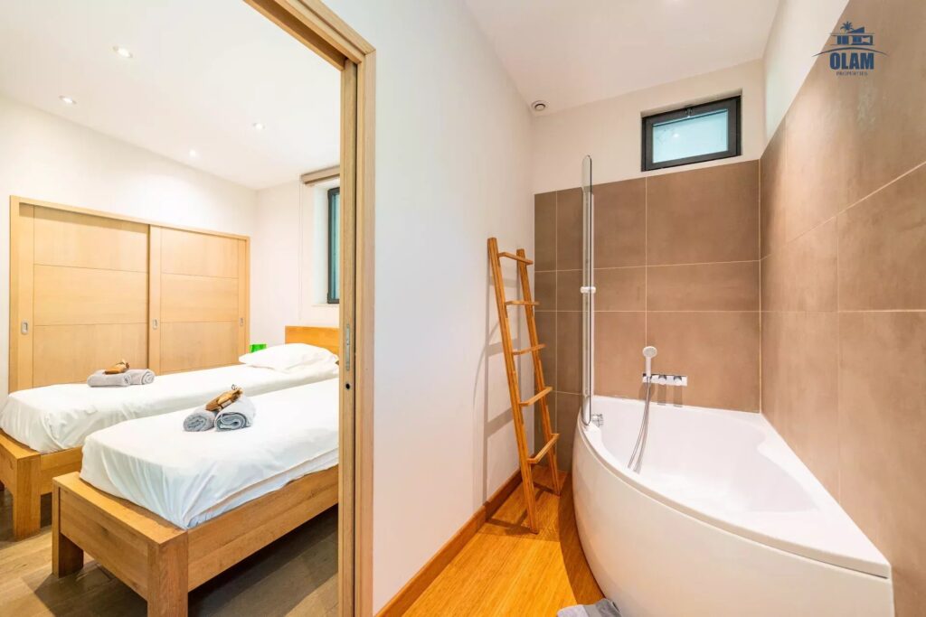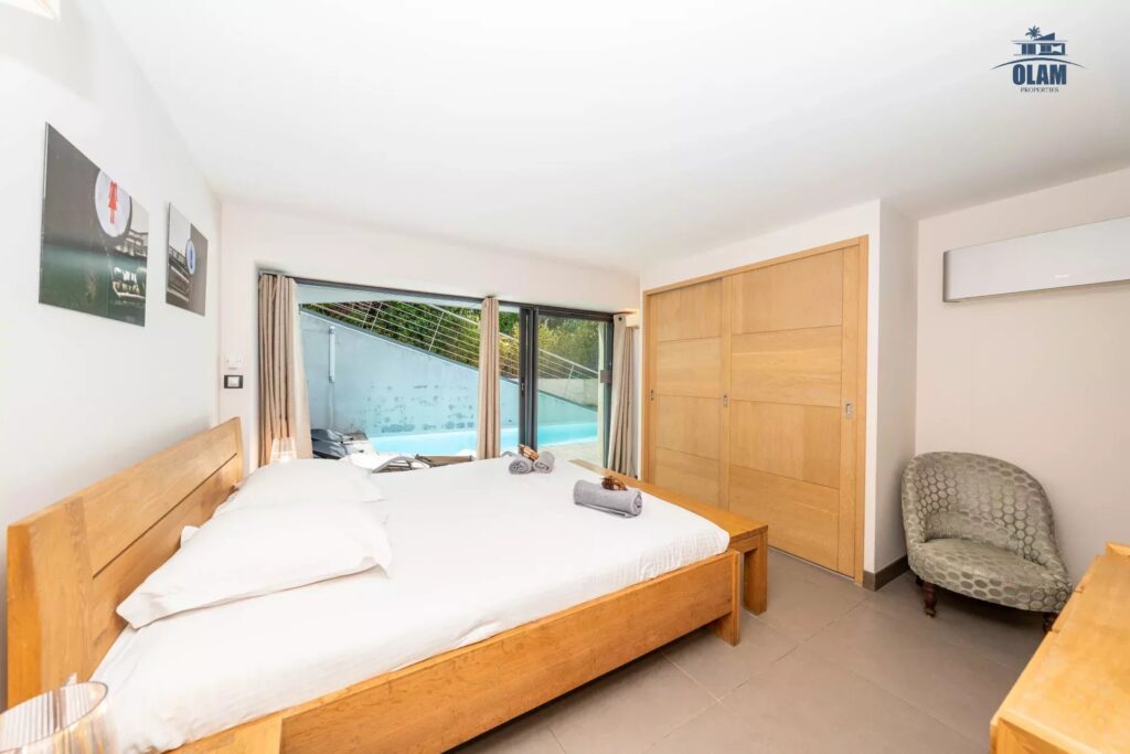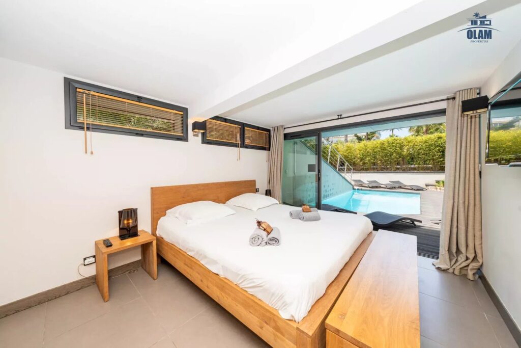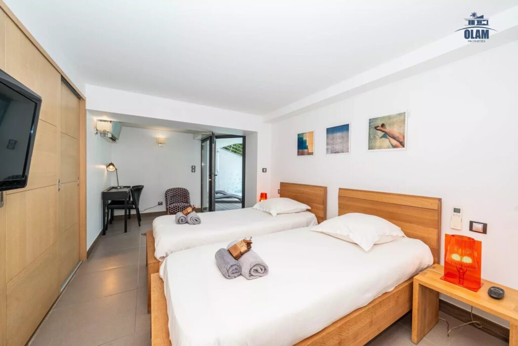 Pool level : junior bedroom #4 (2 single beds), junior bedroom #5 with double bed (180cm) with bathroom (bathtub) which can be shared with the junior, master bedroom #6 with double bed (180cm) with bathroom (bathtub), cinema room, laundry.