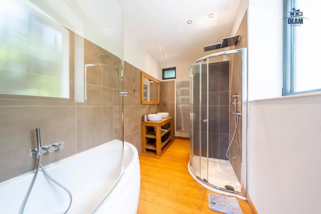 Level 0 : Large living room, Us kitchen fully equipped, dinning space, guest toilets, junior bedroom #1 (2 single beds) with bathroom (bathtub), junior bedroom #2 with double bed (180cm) with bathroom (bathtub), master bedroom #3 with double bed (180cm) with bathroom (bathtub & shower).
