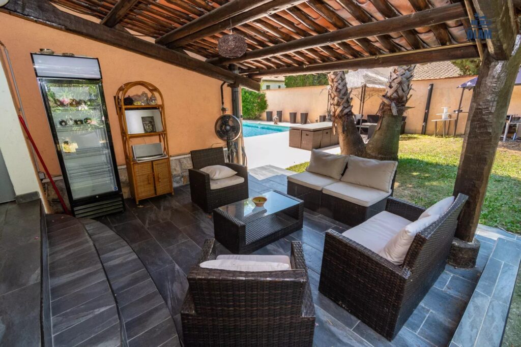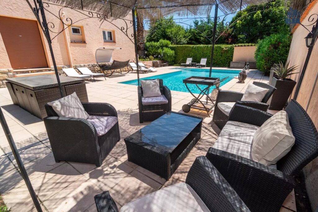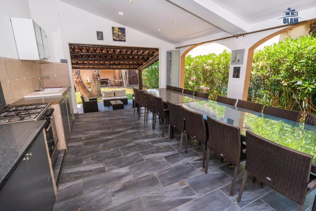 Cette maison composée de 5 pièces vous offre de grands extérieurs : piscine, transats, salon de jardin, table de jardin, barbecue, cuisine extérieure entièrement équipée sous préau avec une grande table de réception pour 14 personnes.