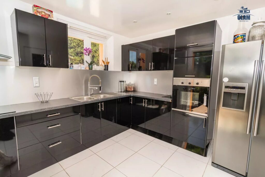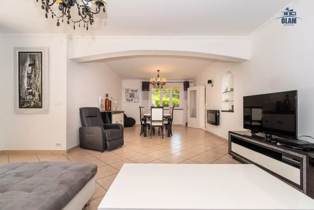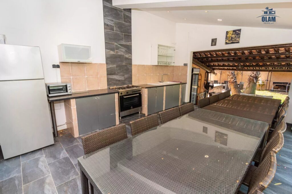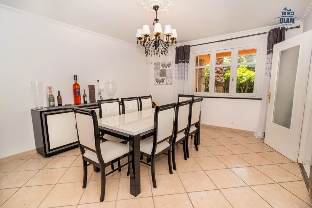 Au rez de chaussée, vous trouverez une belle pièce à vivre avec une table à manger ainsi qu’une cuisine séparée donnant sur l’extérieur, entièrement équipée.