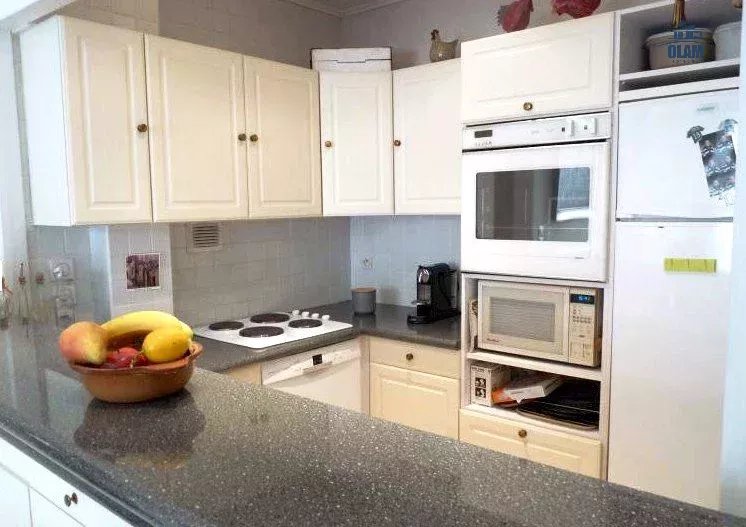Grande cuisine équipée donnant sur le séjour avec tout le matériel nécessaire (four, micro ondes, réfrigérateur, lave vaisselle..)
