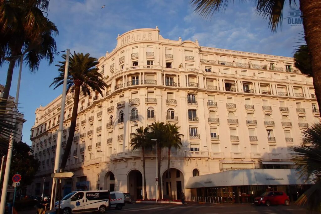 Le Palais Miramar est situé dans le “Carré d’or” de la Croisette, entre le Carlton et le Martinez.